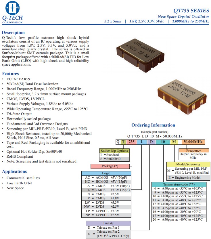 QT735LWE10M-156.250MHz,LVDS差分石英晶振,6G基站晶振, Q-Tech晶振,QT735有源晶振,QT735LWE10M-156.250MHz晶振,電壓3.3V微型石英晶體,LVDS輸出差分石英晶振,頻率156.25MHz,工作溫度-55~125°C,5032mm貼片晶振,小體積晶振,高抗沖擊晶振,高可靠性晶振,低地球軌道應用晶振,新空間應用晶振,商業(yè)衛(wèi)星應用晶振,6G基站晶振.