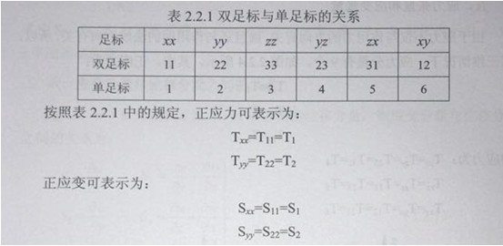 沿x方向應(yīng)力和y方向應(yīng)力的特點是,力的方向與作用面垂直(或力的方向與作用面的法線方向平行)。為了反應(yīng)這兩個方向在應(yīng)力符號上要附加兩個足標(biāo),例如Tx和Ty。應(yīng)力的第一個足標(biāo)表示力的方向,第二個足標(biāo)表示作用面的法線方向。同理,應(yīng)變也有兩個足標(biāo),例如Sx和Sy應(yīng)變的第一個足標(biāo)表示原長度的方向,第二個足標(biāo)表示伸長量的方向,Tx、Ty又稱正應(yīng)力(或伸縮應(yīng)力),Sx、Sy又稱為正應(yīng)變(或伸縮應(yīng)變)為了簡便,通常將足標(biāo)中的(x,y,z)用(1,2,3)表示,而且將雙足標(biāo)簡化為單足標(biāo),雙足標(biāo)與單足標(biāo)的關(guān)系如表2.2.1所示。