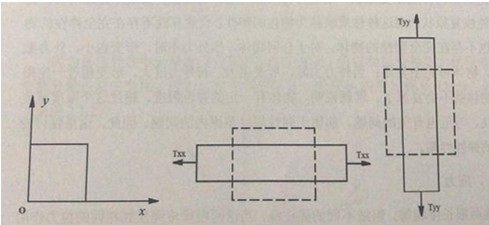 如圖2.2.1(a)所示的小方片,當(dāng)它受到x方向的應(yīng)力作用時,除在x方向產(chǎn)生伸長外,同時在y方向也產(chǎn)生收縮,如圖2.2.1(b)所示。同樣,當(dāng)小方片受到y(tǒng)方向的應(yīng)力作用時,除了在y方向產(chǎn)生伸長外,同時在x方向也產(chǎn)生收縮