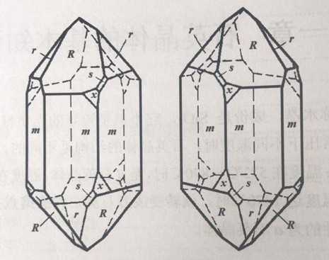 在結(jié)晶學(xué)中,石英晶體諧振器內(nèi)部結(jié)構(gòu)可以概括為是由一些“點(diǎn)子”在空間有規(guī)則地作周期的無(wú)限分布:“點(diǎn)子”代表原子、離子、分子或其集團(tuán)的重心。這些“點(diǎn)子”的總體稱為點(diǎn)陣,構(gòu)成石英晶體的是二氧化硅分子,而二氧化硅分子的重心又正好與硅離子重合,因此硅離子的點(diǎn)陣就可以反映出石英晶體的內(nèi)部結(jié)構(gòu)。石英晶體的各層硅離子若按右手螺旋規(guī)則分布,則稱為右旋石英晶體;若按左手螺旋規(guī)則分布,稱為左旋石英晶體。從外形上看,右旋石英晶體的s面在R面的右下方或m面的左上方,左旋石英晶體的s面在R面的左下方或m面的右上方(見圖1.1.1),它們互為鏡象對(duì)稱。