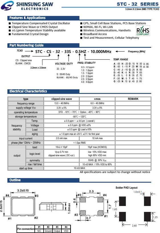韓國新松晶振,STC-32溫度補償晶體振蕩器,STC-CS-32-33S-0.5HZ-16.000MHz晶振,小型SMD有源晶振,從最初超大體積到現(xiàn)在的7050mm,6035mm,5032mm,3225mm,2520mm體積,有著翻天覆地的改變,體積的變小也使產品帶來了更高的穩(wěn)定性能,接縫密封石英晶體振蕩器,精度高,覆蓋頻率范圍寬的特點,SMD高速自動安裝和高溫回流焊設計,Optionable待機輸出三態(tài)輸出功能,電源電壓范圍:1.8V~5V,高穩(wěn)定性,低抖動,低功耗,主要應用領域:無線通訊,高端智能手機,平板筆記本WLAN,藍牙,數碼相機,DSL和其他IT產品的晶振應用,三態(tài)功能,PC和LCDM等高端數碼領域,符合RoHS/無鉛.