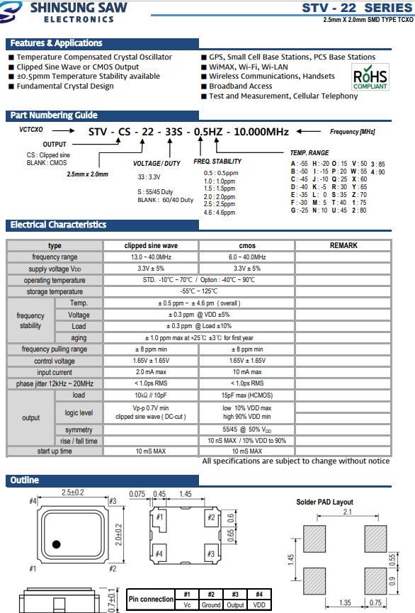 SHINSUNG韓國晶振,STV-22無線通信振蕩器,STV-CS-22-33S-0.5HZ-12.000MHz晶振,有源晶振,是指晶體本身起振需要外部電壓供應(yīng),起振后可直接驅(qū)動CMOS集成電路,產(chǎn)品本身已實現(xiàn)與薄型IC(TSSOP封裝,TVSOP封裝)同樣的1mm厚度,斷開時的消費電流是15µA以下,編帶包裝方式可對應(yīng)自動搭載及IR回流焊接(無鉛對應(yīng))產(chǎn)品有幾種電壓供選1.8V,2.5V,3V3.3V,5V,以應(yīng)對不同IC產(chǎn)品需要