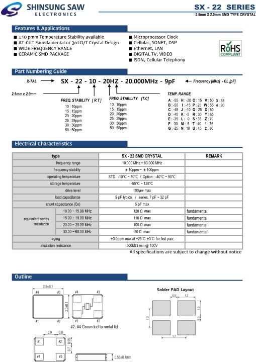 SHINSUNG晶振,SX-22超小型晶振,SX-22-10-20HZ-26.000MHz-9pF晶振,小型貼片石英晶振,外觀尺寸具有薄型表面貼片型石英晶體振蕩器,特別適用于有小型化要求的市場領(lǐng)域,比如智能手機(jī),無線藍(lán)牙,平板電腦等電子數(shù)碼產(chǎn)品.晶振本身超小型,薄型,重量輕,晶體具有優(yōu)良的耐環(huán)境特性,如耐熱性,耐沖擊性,在辦公自動(dòng)化,家電相關(guān)電器領(lǐng)域及Bluetooth,WirelessLAN等短距離無線通信領(lǐng)域可發(fā)揮優(yōu)良的電氣特性,滿足無鉛焊接的回流溫度曲線要求.
