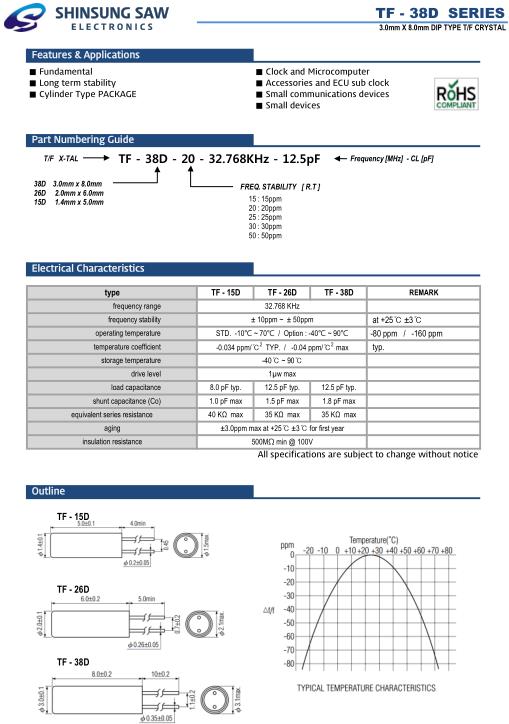 SHINSUNG新松晶振,TF-38D插件晶振,TF-38D-25-32.768KHz-12.5pF晶振,SHINSUNG Crysta成立于1990年,并開始生產(chǎn)石英晶振,濾波器,石英晶體振蕩器,同時向客戶提供最新的新松貼片石英晶振或通孔型晶振單元,時鐘有源晶振,溫補晶振等晶振產(chǎn)品,一直以供應(yīng)優(yōu)質(zhì)晶振產(chǎn)品為信念,不斷給社會創(chuàng)造價值.