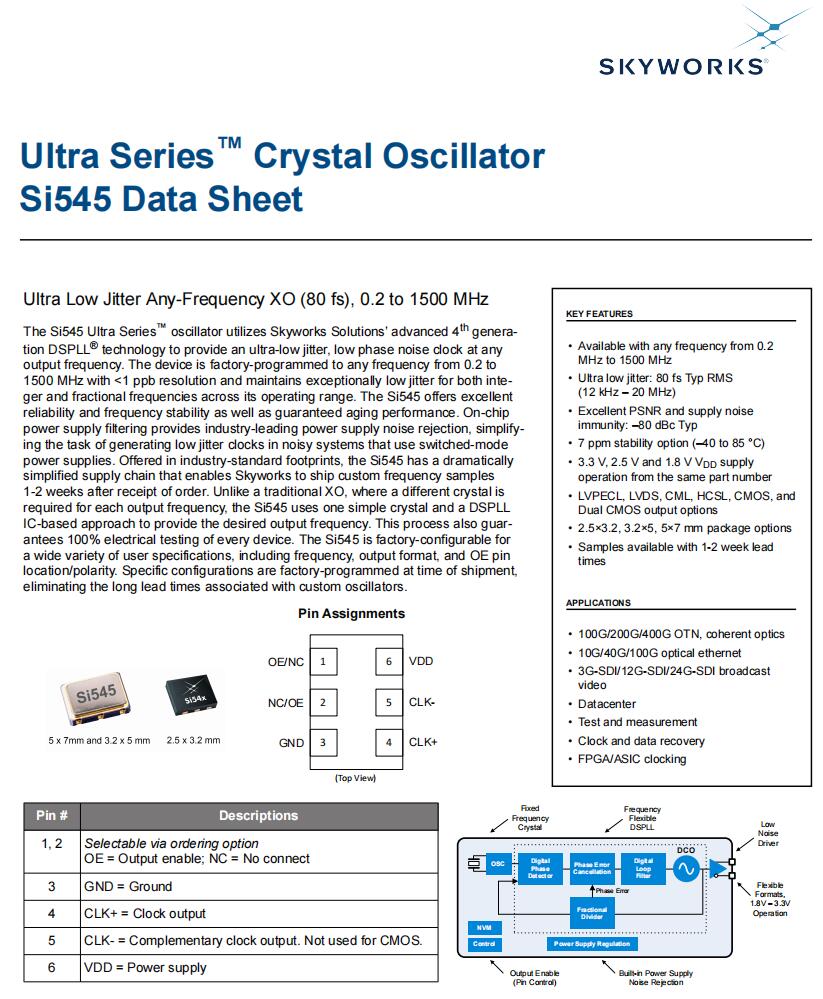 Skyworks有源晶振,545BAA78M1250BBGR晶振,6G以太網(wǎng)晶振 ,美國Skyworks晶振公司,Si545有源晶振,545BAA78M1250BBGR晶振,歐美進(jìn)口晶振,貼片石英晶體振蕩器,5032mm晶振,頻率200MHz,電壓3.3V,工作溫度-40~85°C,頻率穩(wěn)定性50ppm,LVDS差分晶振,超低抖動(dòng)晶振,6G以太網(wǎng)晶振,數(shù)據(jù)中心應(yīng)用晶振,測試與測量設(shè)備晶振,時(shí)鐘和數(shù)據(jù)恢復(fù)應(yīng)用晶振.Si545系列振蕩器采用Skyworks Solutions先進(jìn)的第4代 DSPLL®技術(shù),在任何輸出頻率下提供超低抖動(dòng),低相位噪聲時(shí)鐘。該設(shè)備在工廠編程為0.2至1500 MHz的任何頻率,分辨率<1 ppb,并在其工作范圍內(nèi)保持整數(shù)和分?jǐn)?shù)頻率的極低抖動(dòng)。Si545具有出色的可靠性和頻率穩(wěn)定性以及保證的老化性能。片上電源濾波提供業(yè)界領(lǐng)先的電源噪聲抑制,簡化了在使用開關(guān)模式電源的噪聲系統(tǒng)中產(chǎn)生低抖動(dòng)時(shí)鐘的任務(wù)。Si545提供行業(yè)標(biāo)準(zhǔn)的足跡,大大簡化了供應(yīng)鏈,使Skyworks能夠在收到訂單后1-2周內(nèi)發(fā)送定制頻率樣品。不同于傳統(tǒng)的XO,每個(gè)輸出頻率都需要不同的晶體,Si545使用一個(gè)簡單的晶體和基于DSPLL ic的方法來提供所需的輸出頻率。這個(gè)過程也保證保證每個(gè)設(shè)備100%的電氣測試。Si545可在工廠配置,適用于各種用戶規(guī)格,包括頻率,輸出格式和OE引腳位置/極性。