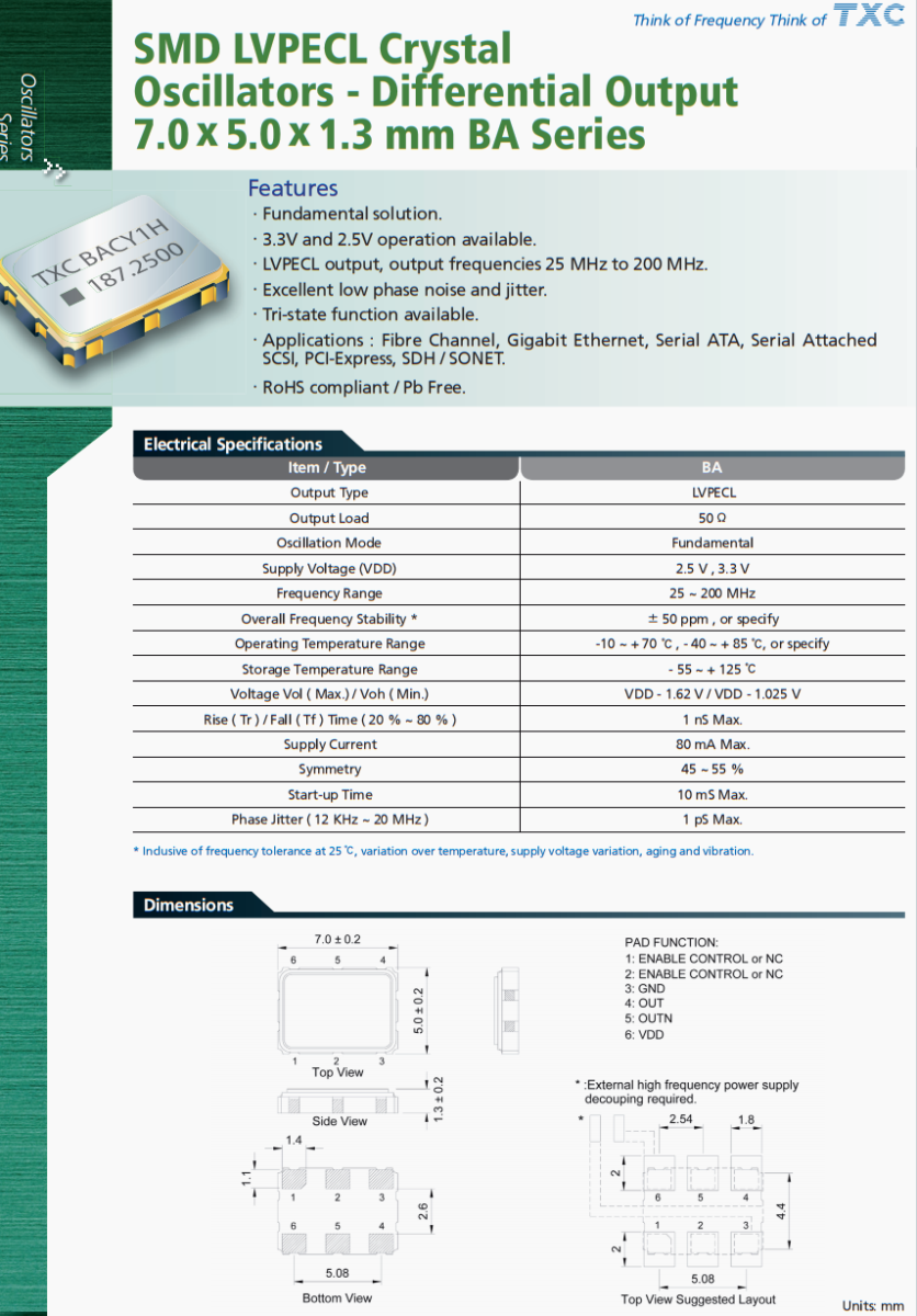 TXC臺(tái)產(chǎn)晶振,北斗衛(wèi)星晶振,BA-25.000MBE-T晶振,臺(tái)灣TXC晶振公司,有源晶振,差分晶振,小尺寸晶振,BA-25.000MBE-T晶振,六腳晶振,LVPECL晶振,進(jìn)口晶振,汽車晶振,無人機(jī)晶振,航空航天晶振,耐高溫晶振,石英晶振,6G晶振,BA系列SMD LVPECL晶體,振蕩器-差分輸出,7.0 5.0 1.3 mm ,特性,基本解決方案。3.3V和2.5V可選。LVPECL輸出,輸出頻率25mhz ~ 200mhz。出色的低相位噪聲和抖動(dòng)。三態(tài)功能。應(yīng)用:光纖通道,千兆以太網(wǎng),串行ATA,串行連接。scsi, PCI-Express, SDH / SONET。符合RoHS標(biāo)準(zhǔn)/無鉛。