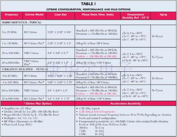 新型Citrine系列晶體振蕩器專為在要求靜態(tài)和動(dòng)態(tài)條件下具有低相位噪聲性能的最苛刻應(yīng)用提供廣泛的貼片晶振產(chǎn)品.黃水晶振蕩器可以配置為1~650MHz之間的任何固定頻率.黃水晶系列有八種配置.低頻HF振蕩器和VHF振蕩器均可使用,也可以不使用隔振系統(tǒng).而且,“PLUS”系列還提供HF和VHFCitrines,當(dāng)應(yīng)用需要額外的功能時(shí),可添加乘法器,分頻器,放大器,濾波器和雙輸出. Citrine系列具有多種包裝配置,可以根據(jù)頻率,所需的選件,性能規(guī)格和其他應(yīng)用注意事項(xiàng)進(jìn)行選擇.有關(guān)標(biāo)準(zhǔn)Citrine配置和性能選項(xiàng),請(qǐng)參見(jiàn)表1. 黃水晶靜態(tài)相位噪聲性能