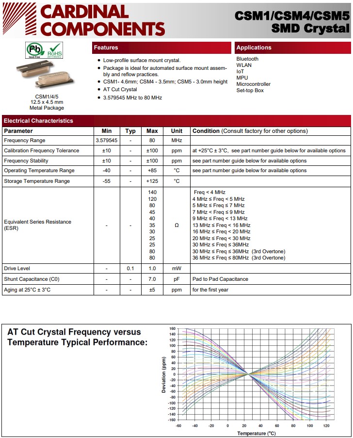 美國Cardinal卡迪納爾晶振CSM系列,晶振CSM1:13x4.7x4.6毫米,CSM4:13x4.7x3.5毫米,CSM5:13x4.7x3.0毫米,SMD晶體,兩腳貼片晶振,無源晶振,石英貼片晶振,石英晶體諧振器,無鉛環(huán)保晶振,薄型表面貼裝水晶,封裝是自動化表面安裝組裝和回流實踐的理想選擇,CSM1-4.6毫米;CSM4-3.5毫米;CSM5-3.0mm高,AT切割水晶,頻率范圍:3.579545MHz至80MHz。工作溫度范圍:-40℃至+85℃,該無源晶振應用于:藍牙,無線局域網(wǎng),物聯(lián)網(wǎng),最大功率放大器,微控制器,機頂盒。石英晶體CSM1Z-A5B2C5-60-24.0D18適用于無線局域網(wǎng)應用