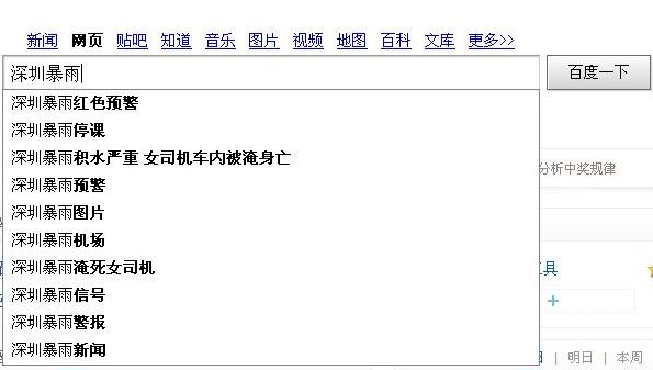 例如近日深圳暴風雨交加,許多新聞等節(jié)目接連播出關(guān)于深圳暴雨紅色預(yù)警消息,在網(wǎng)上引起了軒然大波,使得深圳市比往年提前21天宣告入汛。對于“提早報到”的暴雨,我市紅樹林氣象站昨日記錄到第一大小時雨量(114.8毫米),局部地域強降雨集中在寶安、光明、龍華等區(qū),并導(dǎo)致我市150多處不同程度的水浸,部分航班取消。那么對于這件事情,網(wǎng)民主要搜索些什么呢?我們使用“深圳深圳暴雨”做為關(guān)鍵詞分別在百度和谷歌上進行了一番測試。