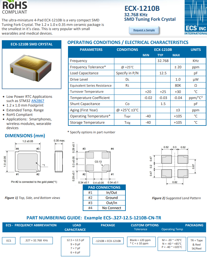 超小型32.768K音叉晶體ECS-.327-12.5-1210B-CN-TR是可穿戴設(shè)備的理想選擇