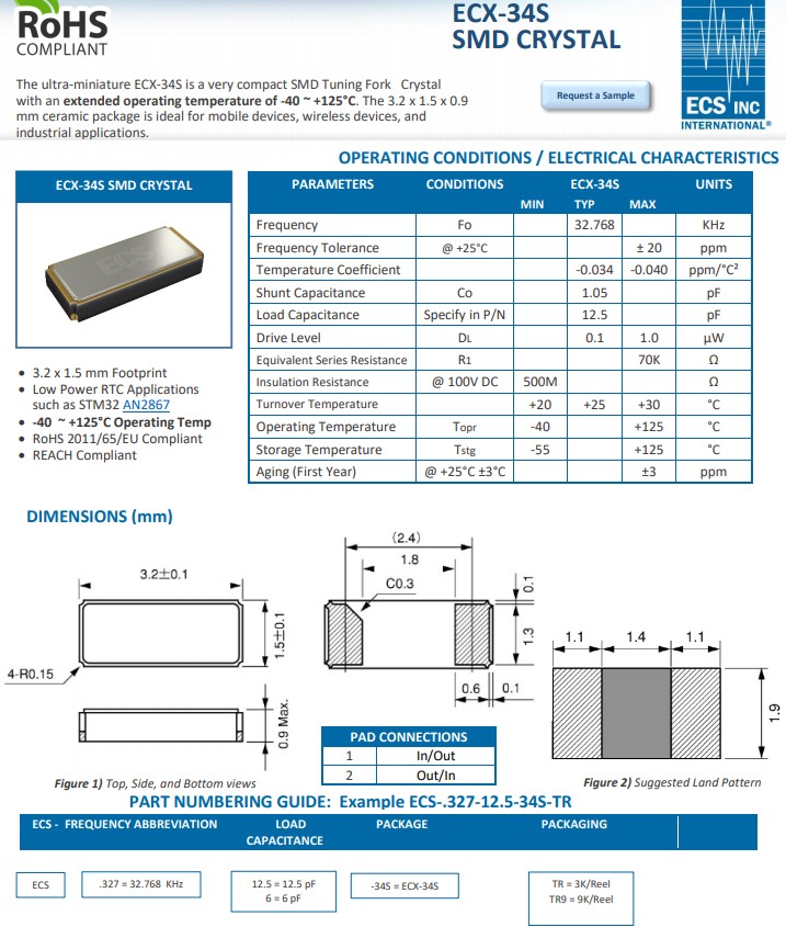 ECS晶振推出超小型ECX-34S系列,編碼ECS-.327-12.5-34S-TR,是一款非常緊湊的SMD音叉晶體,32.768kHz晶振,兩腳貼片晶振,擴(kuò)展工作溫度范圍為-40℃至+125℃。小體積尺寸3.2x1.5x0.9mm陶瓷封裝,非常適合移動(dòng)設(shè)備、無線設(shè)備和工業(yè)應(yīng)用,STM32 AN2867等低功耗RTC應(yīng)用,-40℃至+125℃工作溫度,符合RoHS 2011/65/EU標(biāo)準(zhǔn),符合REACH標(biāo)準(zhǔn).