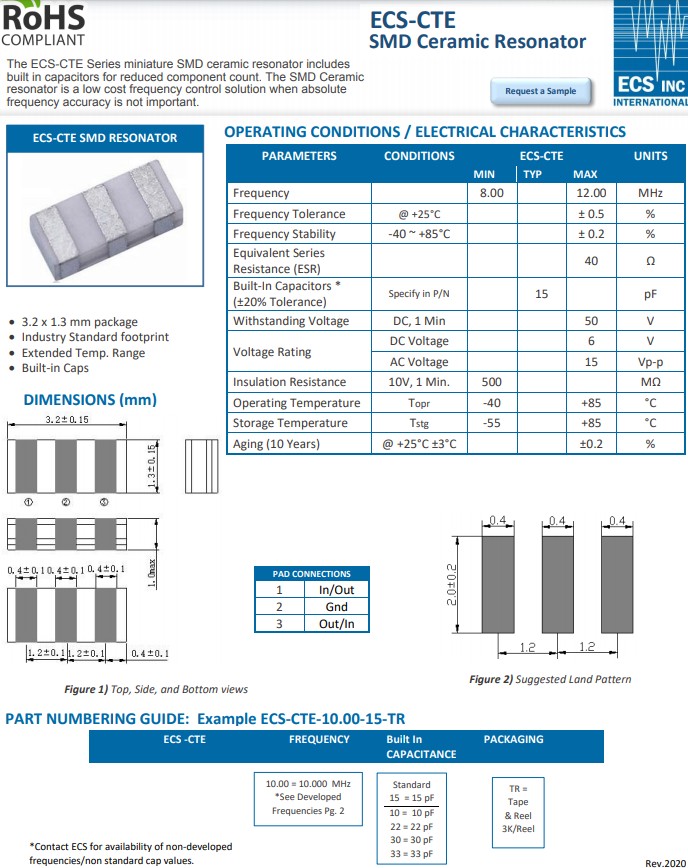 ECS晶振ECS‐CTE系列陶瓷諧振器的ESR為40ω,小體積晶振尺寸采用3.2x1.3x1.0mm封裝三腳貼片晶振。這些陶瓷諧振器非常適合絕對(duì)頻率精度不太重要的低成本應(yīng)用。標(biāo)準(zhǔn)版本在+25°C時(shí)的頻率容差為0.5%,在整個(gè)溫度范圍內(nèi)的頻率容差為0.2%。內(nèi)置電容值選項(xiàng):10pF,15pF,22pF,30pF和33pF。ECS-CTE-10.00-15-TR是復(fù)印機(jī)和遙控器等低成本應(yīng)用的理想選擇。