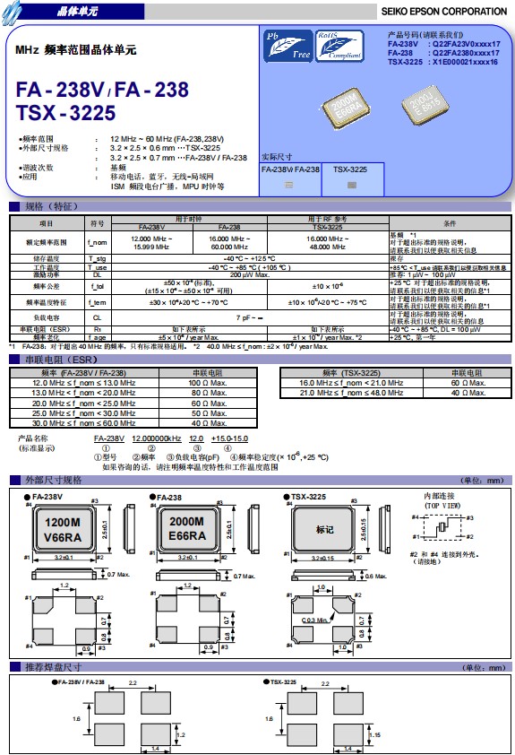 日本愛普生晶振FA-238V是一款小體積尺寸3.2x2.5mm四腳貼片晶振,無源晶振,石英晶體諧振器,F(xiàn)A-238V頻率范圍12.000MHz至15.9999MHz之間,可以在-40℃至+85℃(+105℃)溫度內(nèi)穩(wěn)定工作,該產(chǎn)品具有超小型,輕薄型,耐熱、耐振、耐沖擊等優(yōu)良的耐環(huán)境特性,3225mm體積貼片晶振,該產(chǎn)品已被確定的高信賴性最適合用于汽車電子部件,在極端嚴(yán)酷的環(huán)境條件下也能發(fā)揮穩(wěn)定的起振特性。滿足無鉛焊接的高溫回流溫度曲線要求,符合AEC-Q200標(biāo)準(zhǔn)。被廣泛用于移動通訊,智能手機(jī),平板電腦,汽車電子,移動電話,無線藍(lán)牙,ISM頻段電臺廣播,MPU時(shí)鐘等.
