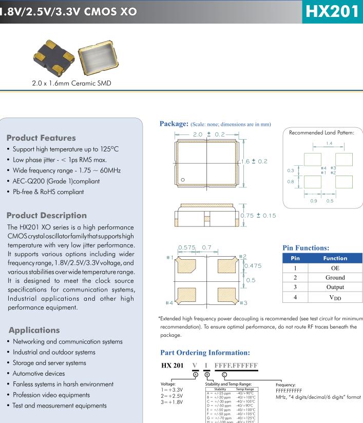 HX201 XO系列是高性能的CMOS時鐘晶體振蕩器家族,支持具有極低抖動性能的高溫度。它支持各種選項,包括更廣泛頻率范圍,1.8V/2.5V/3.3V電壓,和在較寬的溫度范圍內(nèi)具有多種穩(wěn)定性。它是為滿足時鐘源而設(shè)計的通信系統(tǒng)規(guī)范,工業(yè)應(yīng)用等較高設(shè)備性能。