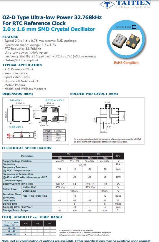 更多>>OXETGLJANF-26.000000泰藝超低功耗32.768kHz RTC參考時鐘