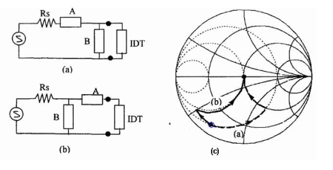 圖1 二種簡單匹配電路方案(a)、(b) 及對應的Smith圓圖路徑(c)匹配結構確定后,如何找到匹配元件值?一般有兩種方法:一是試驗法。借助于矢量網絡分析儀的Smith圓圖和頻響圖實際匹配。二是借助于矢量網絡分析儀,提取SAW濾波器的S參數,計算濾波器的四端網絡導納Y參數,通過軟件匹配計算匹配元件值,最后指導試驗匹配。 實際聲表面濾波器匹配時需要注意的問題: (1) 評估板和系統板上的匹配元件值有些差異,其原因是分布參數不同,需要微調元件值。 (2) 高損耗濾波器通常要求失配,以得到好的通帶特性。
