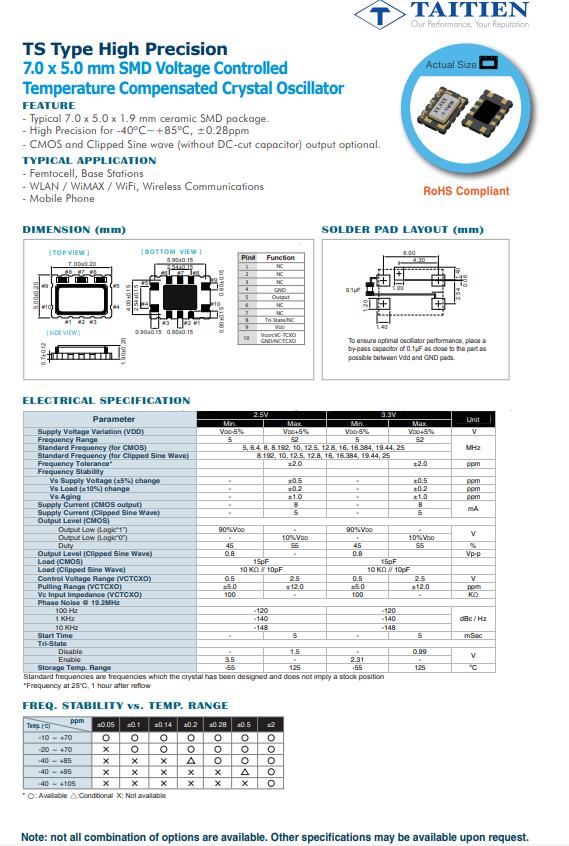| TSEATLJANF-19.200000 | Taitien | TS | VCTCXO | 19.2MHz | 2.8 V ~ 3.3 V |