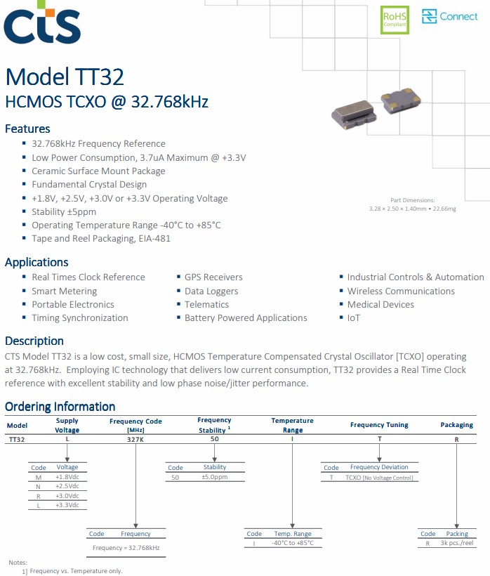TT32系列HCMOS溫度補(bǔ)償晶體振蕩器,TT32M327K50ITR,時(shí)鐘晶振