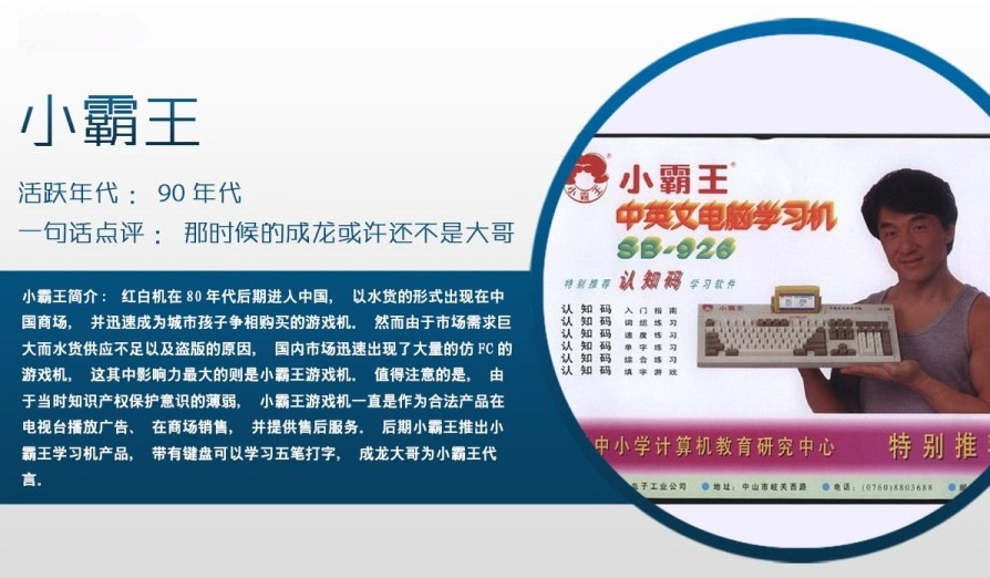 小霸王游戲機一聽就很熟悉吧,在那個年特別火,而且是于成龍代言的,那時候的成龍或許還不是大哥,小霸王游戲機一直是作為合法產(chǎn)品在電視臺播放廣告、在商場銷售,并提供售后服務(wù)。后期小霸王推出小霸王學(xué)習(xí)機產(chǎn)品,帶有鍵盤可以學(xué)習(xí)五筆打字,成龍大哥為小霸王代言。