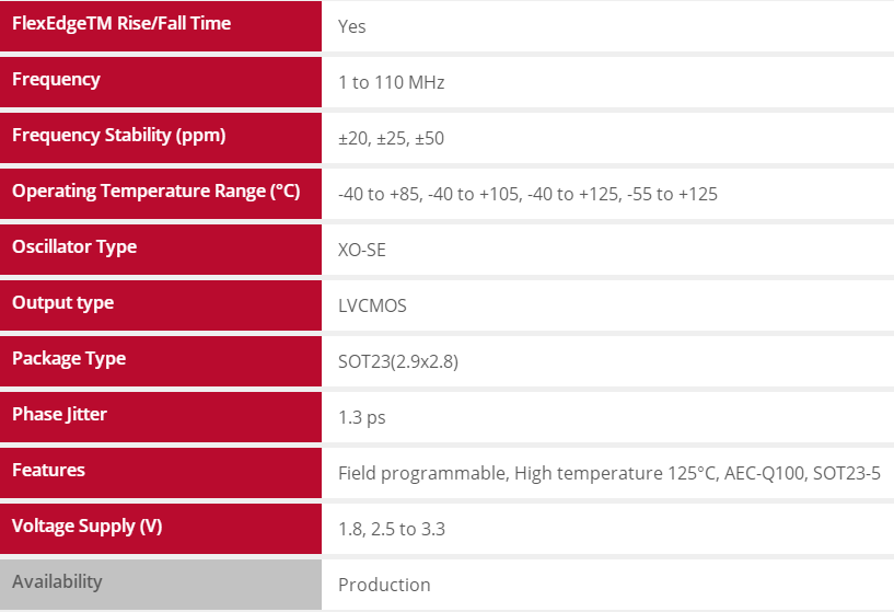 SiTime車用振蕩器相比石英振蕩器可靠性提高30倍,具有以下的特性與優(yōu)勢(shì): - 滿足AEC-Q100標(biāo)準(zhǔn)一級(jí)(-40°C至+125°C)、二級(jí)(-40°C至+105°C)與寬泛的溫度要求(-55°C至+125°C)