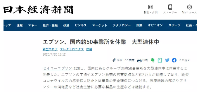 需要注意的是,精工愛普生日本所有據(jù)點(diǎn)雖將在上述期間歇業(yè)停工,不過一些負(fù)責(zé)維持社會(huì)生活所必需的產(chǎn)品,例如醫(yī)療機(jī)器零件、墨水等印表機(jī)消耗品將持續(xù)進(jìn)行生產(chǎn)。