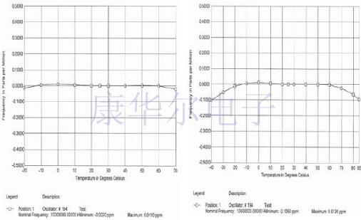 例如,如果將晶振指定為0~+60℃以上的溫度,則它最有可能在-40~+85℃以上的溫度下運(yùn)行而沒有任何問題.但是,它可能會超出其指定的穩(wěn)定性.如果應(yīng)用程序僅需要一個(gè)穩(wěn)定的頻率而不是一個(gè)準(zhǔn)確的頻率,則可能無關(guān)緊要.以下是在兩個(gè)不同溫度范圍內(nèi)測試同一石英晶體振蕩器的測試結(jié)果.左邊的溫度是-20~+70℃.如您所見,它非常穩(wěn)定.右邊的一個(gè)是從-40~+85℃.它不再像在穩(wěn)定的極端溫度.如果溫度穩(wěn)定性在您的系統(tǒng)中至關(guān)重要,則必須在規(guī)格范圍內(nèi)進(jìn)行操作.