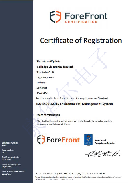 首頁(yè)榮譽(yù)證書(shū) 英國(guó)Golledge Crystal原廠(chǎng)的ISO14001環(huán)境質(zhì)量證書(shū)