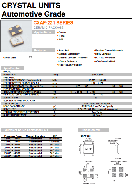 AKER晶振,AKER貼片晶振,CXAF-221諧振器.貼片石英晶體,體積小,焊接可采用自動貼片系統(tǒng),產(chǎn)品本身小型,表面貼片晶振,特別適用于有小型化要求的電子數(shù)碼產(chǎn)品市場領(lǐng)域,因產(chǎn)品小型,薄型優(yōu)勢,耐環(huán)境特性,包括耐高溫,耐沖擊性等,在移動通信領(lǐng)域得到了廣泛的應(yīng)用,晶振產(chǎn)品本身可發(fā)揮優(yōu)良的電氣特性,滿足無鉛焊接的高溫回流溫度曲線要求.