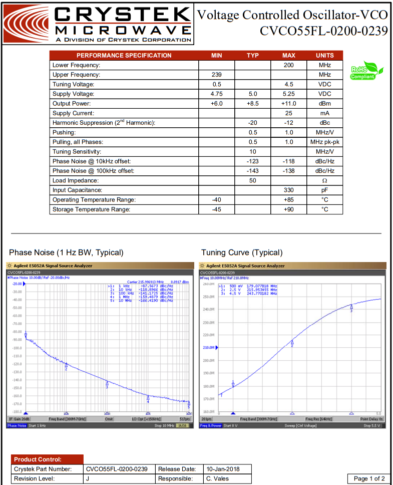 CVCO55FL-0200-0239在美國設(shè)計和制造,采用行業(yè)標(biāo)準(zhǔn)的0.5 x 0.5英寸SMD封裝。輸入電壓為5v,最大電流消耗為25ma。拉力和推力分別最小化到1.0 MHz pk-pk和1.0 MHz/V。二次諧波抑制典型值為-20 dBc。