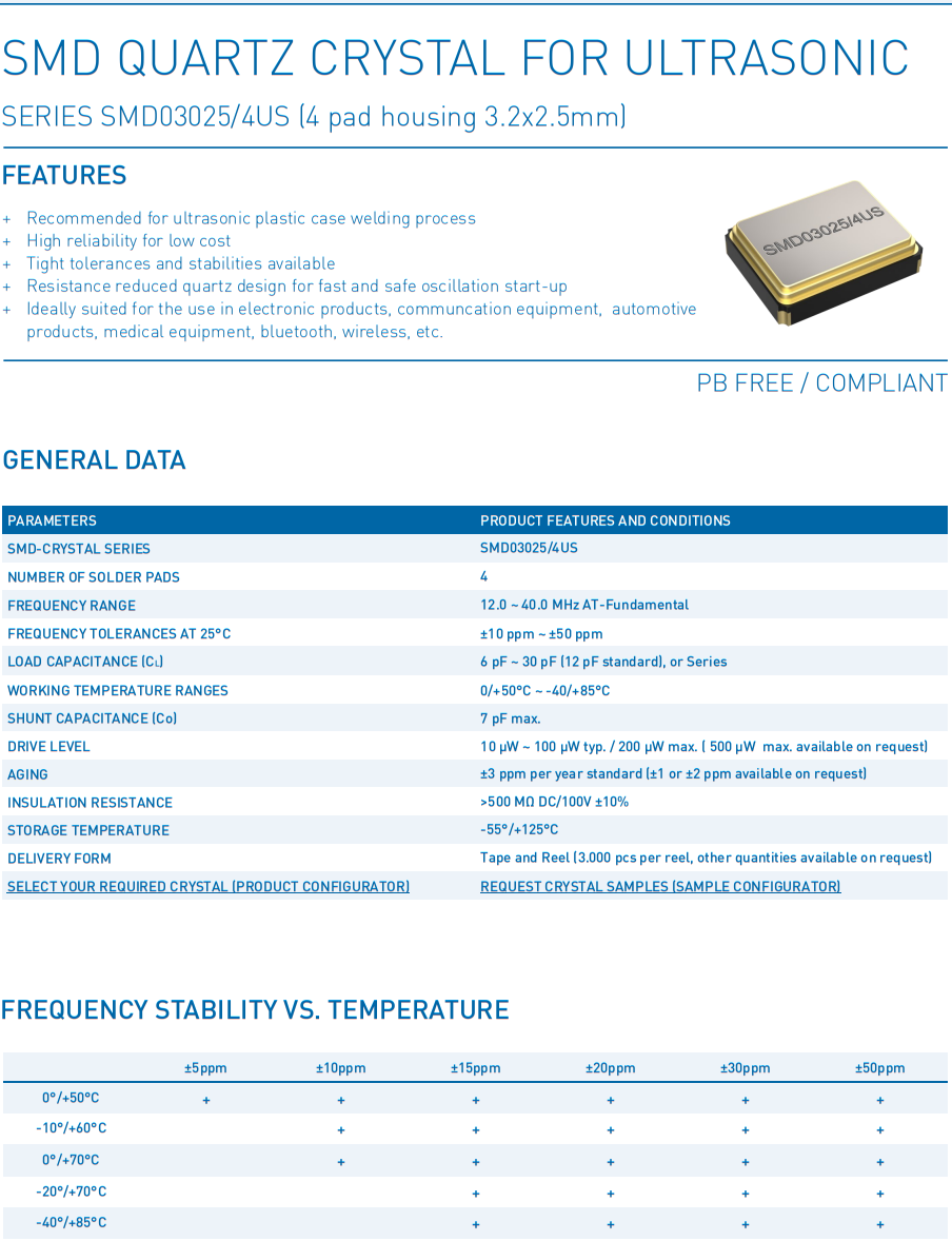 “SMD03025/4US”的頻率范圍為12-40 MHz,在+25°C時,頻率公差從±10 ppm開始,在-20/+70°C的溫度范圍內(nèi),溫度穩(wěn)定性從±10 ppm開始。在工業(yè)溫度范圍-40/+85°C之外,最接近的溫度穩(wěn)定性為±15 ppm。