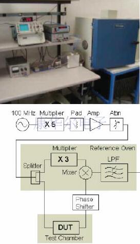 從一開始就意識到,由于室內(nèi)環(huán)境溫度的變化,測試臺部件,測試設(shè)備和電纜的溫度系數(shù)會產(chǎn)生重大的測量問題.為了最大程度地減少這些問題,對參考頻率功率分配器,參考乘法器和相位比較混頻器以及低通濾波器進(jìn)行了烘箱處理(圖3).