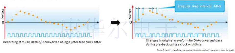 頻率穩(wěn)定性(頻率在延長(zhǎng)的時(shí)間內(nèi)不會(huì)變化的特性)通常被視為晶體振蕩器的重要屬性.但是,音頻設(shè)備需要短期而不是長(zhǎng)期的穩(wěn)定性.在這樣的背景下,通常將頻率穩(wěn)定度約為±30~±100ppm的SPXO(*4)用作主時(shí)鐘.高端音頻系統(tǒng)可能會(huì)配備OCXO(*5)來(lái)獲得更高質(zhì)量的聲音.
