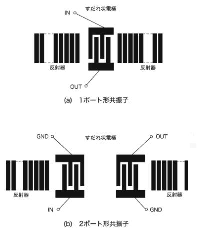 圖三顯示了SAW諧振器的基本結(jié)構(gòu),通過叉指電極之間產(chǎn)生駐波并增加電極數(shù)量,可以實現(xiàn)具有高Q的諧振器。圖四所示,SAW諧振器具有(a)單端口諧振器和(b)雙端口諧振器。單端口型石英晶體諧振器中心簾狀電極與設置在任一側(cè)上的結(jié)構(gòu),以產(chǎn)生駐波的反射器是由叉指電極,諧振器會激勵反射器表面反射的。它主要應用于使用高Q的諧振器和窄帶濾波器。雙端口型諧振器本身是窄帶濾波器結(jié)構(gòu),將用于所述高Q的振蕩器,高頻帶的窄帶濾波器比單端口型諧振器更優(yōu)越。
